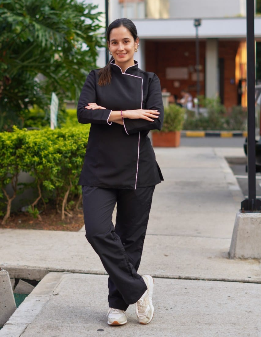 Conjunto antifluido chef con cierre invisible lateral, manga 3/4 y sesgo empitado