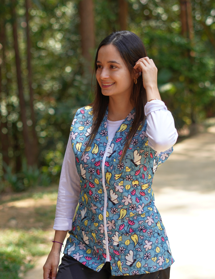 Conjunto estampado manga sisa en tela antifluido con tres bolsillos y cierre frontal